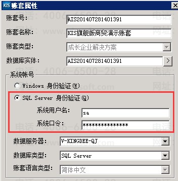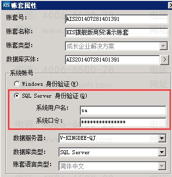 解决方案:账套管理中对应账套的属性的系统账号改为“SQL Server 身份验证”,输入系统用户sa,并输入sa密码点击确定,重新登录主程序即可。