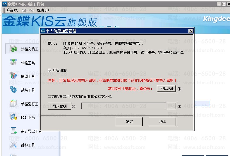 如图所示,在使用KIS云旗舰版过程中,出现弹框,需按提示下载并导入加密密钥。