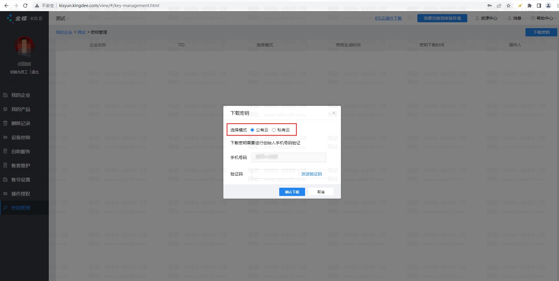 2、点击下载密钥,选择模式,获取验证码,输入获取的验证码,点击确认下载;
