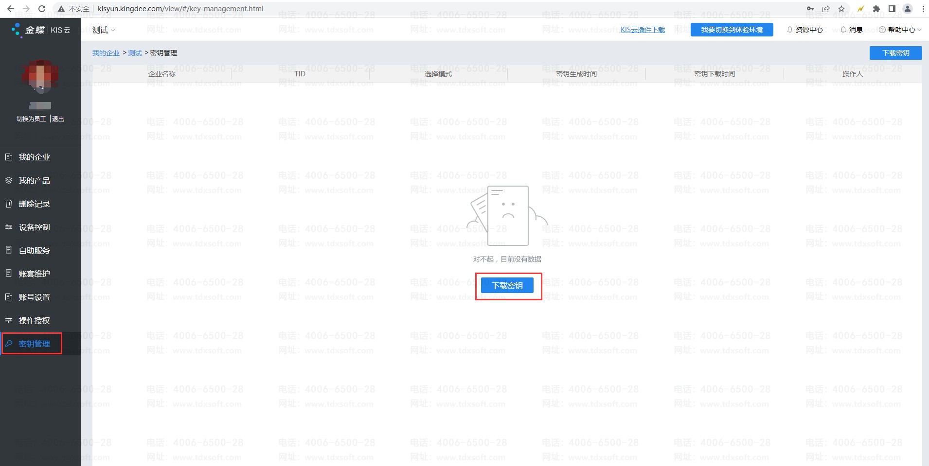 1、使用企业云平台的管理员账号登录KIS云管理中心(http://kisyun.kingdee.com/),找到密钥管理;