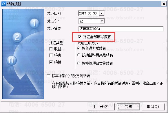 2、在倒数第二步界面,勾选参数“凭证全部填写摘要”,再点击完成,生成的凭证每行均会有摘要。