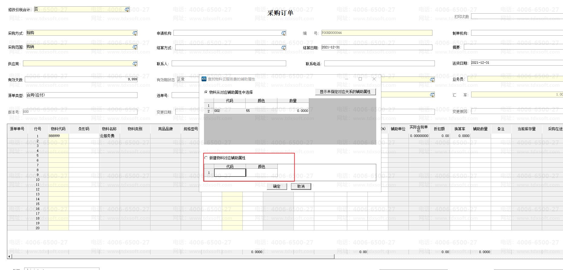 (2)在物料基础资料页勾选启用辅助属性管理后,选择物料辅助属性类别,进入采购订单录入界面,在辅助属性栏内按F7,可自定义新增物料的辅助属性。
