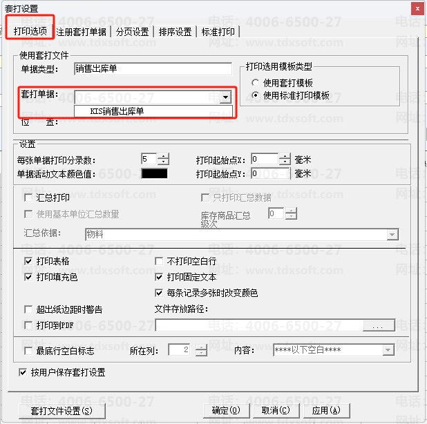 5、在【套打设置】界面中,【打印选项】页签中,【使用套打文件】中设置【套打单据】。