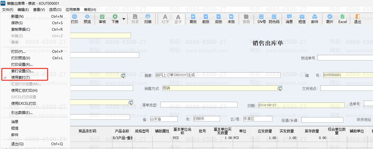 3、在【销售出库单-查看】界面中,选择【文件】-勾选【使用套打】,再点击【套打设置】进入【套打设置】界面;