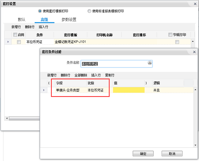在套打设置中也可以通过“业务类型”字段来设置套打条件。操作界面详见下图: