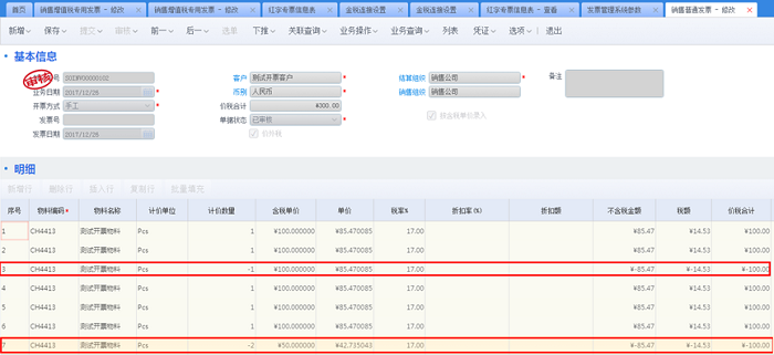 这张蓝字销售发票中,第3跟第7行均为负数行,开票时就作为折扣行处理。