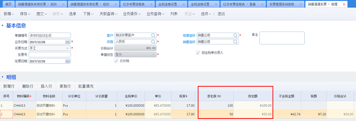 2、折扣额直接填在销售发票明细的折扣额字段中