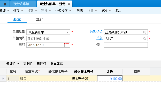 可以通过现金转账单把现金为空余额转到现金账号