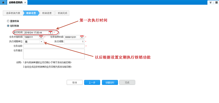 定时核销功能是通过应收收款核销(即有向导界面的匹配条件核销)实现的。在设置了核销方案、核销组织后,进入核销设置界面,在核销设置界面里可以设置本次是定时核销还是直接核销,如果设置为定时核销,系统则会根据用户的设置以后定期进行核销。