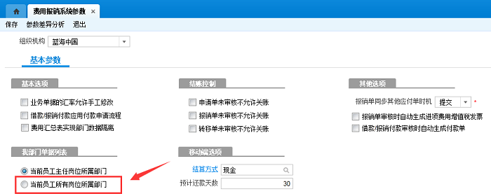 2.检查该员工任岗信息中是否有勾选“主任岗”,若未勾选,此时需要进入【费用报销系统参数】勾选参数“当前员工所有岗位所属部门”。(注意:系统默认勾选参数“当前员工主任岗位所属部门”,此时要求该员工任岗信息中要勾选“主任岗”)