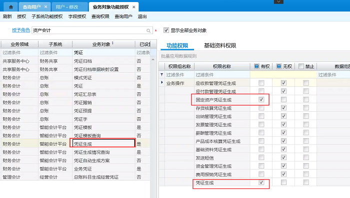 1、版本号小于7.7.0.202109,即未升级2021年9月份补丁,凭证生成权限校验是取操作人,操作人必须有账簿查看权限和单据对应模块的凭证生成权限才可以执行凭证生成,否则提示没有单据凭证生成权限。
