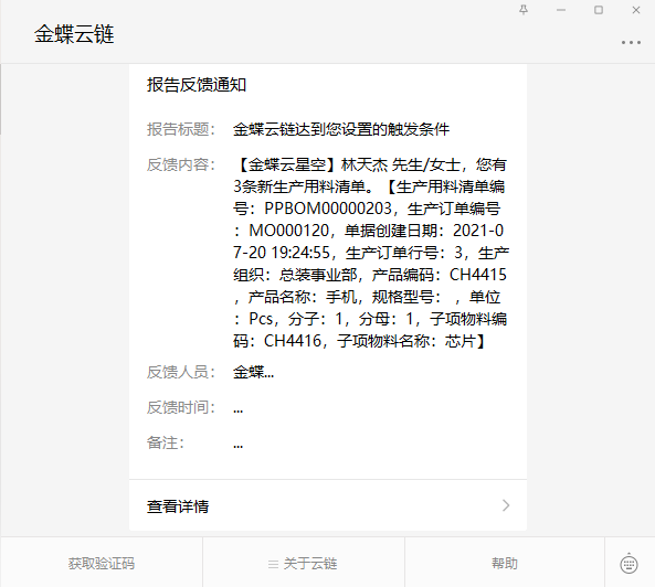 业务场景:金蝶云星空系统里保存生产订单时自动创建生产用料清单,当有新的生产用料清单时提醒仓库人员检查库存或配货。通过配置金蝶云链的方式自动发送新生产用料清单信息到微信。