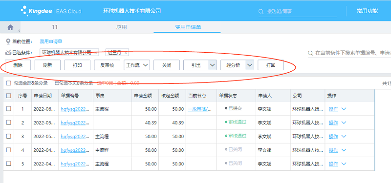 费用申请单的其它操作包括两大类,一类是在序时簿上,另一类是在单据上。