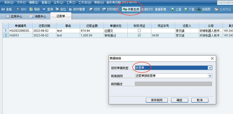 • 财务在EAS Cloud客户端还款单序时簿选中需要关联收款的还款单,点【关联生成】按钮系统通过单据转换规则生成收款单