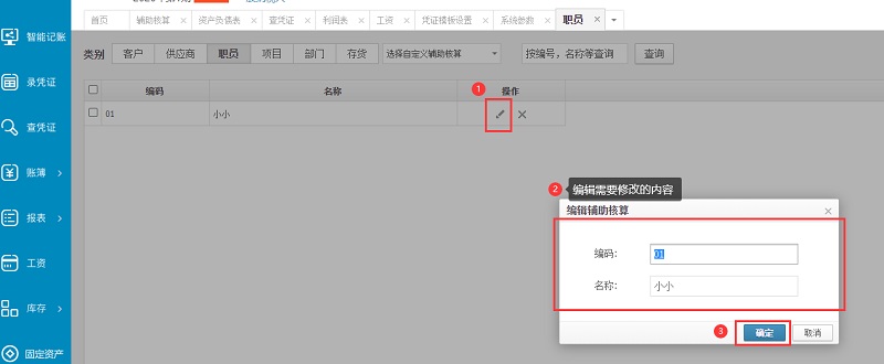 打开【设置】 -- 【辅助核算】 -- 【职员】,编辑修改即可