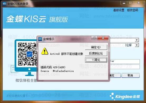 如图所示,登录KIS云旗舰版出现提示“Activex 部件不能创建对象”,