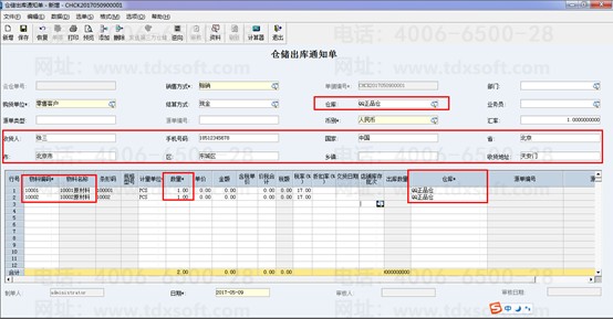 1.在供应链-仓存管理-第三方仓储出入库通知单-仓储出库单新增中新增仓储入库通知单,选择需要仓储入库的具体商品信息、数量,以及收货人的详细信息,填写好仓库,以及其他信息之后保存,审核。除新增的出库通知单,其他来源的单据流程参考供应链流程直接下推即可。