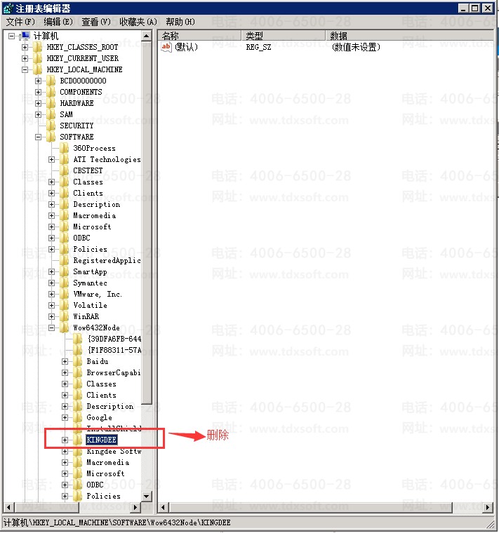 3.删除Kingdee 文件夹卸载后32位操作系统删除C:\Program Files目录下的kingdee文件夹和C:\Program Files\Common Files 目录下的Kingdee文件夹;64位操作系统加删除C:\Program Files (x86)目录下的kingdee文件夹和C:\Program Files (x86)\Common Files目录下的Kingdee文件夹;如果安装在其他盘,找到对应盘安装路径删除对应的Kingdee文件夹。4.删除Kingdee注册表【Windows + R键】输入regedit进入注册表:如下图删除注册表编辑器中KEY_LOCAL_MACHING/SOFTWARE目录下的KINGDEE文件夹以及HKEY_CURRENT_USER/SOFTWARE目录下的KINGDEE文件夹(没有可不删除)