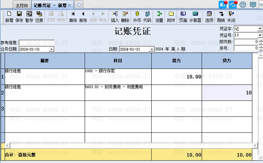 我们使用金蝶等财务软件时,涉及到一些期间费用负数的情况,比如收到银行利息。有些财务朋友,入账的时候,银行存款 借方10,财务费用-利息费用 贷方10,如下图