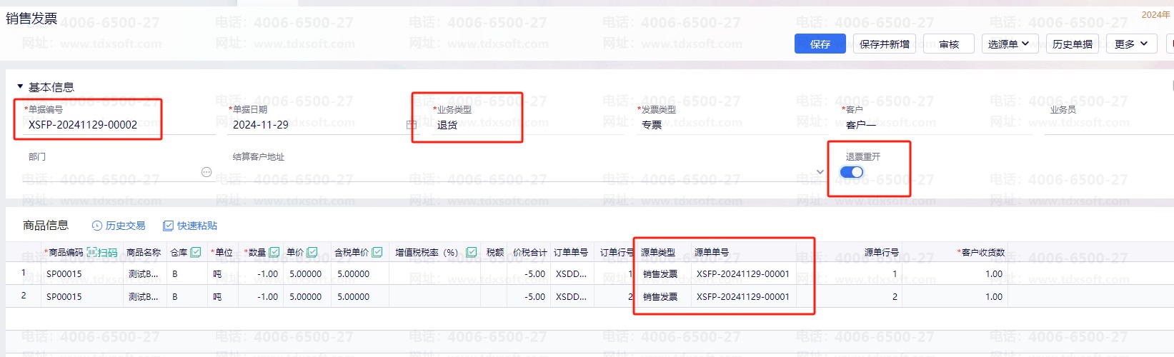 退货类型的销售发票(销售红字发票)没有开启退票从开