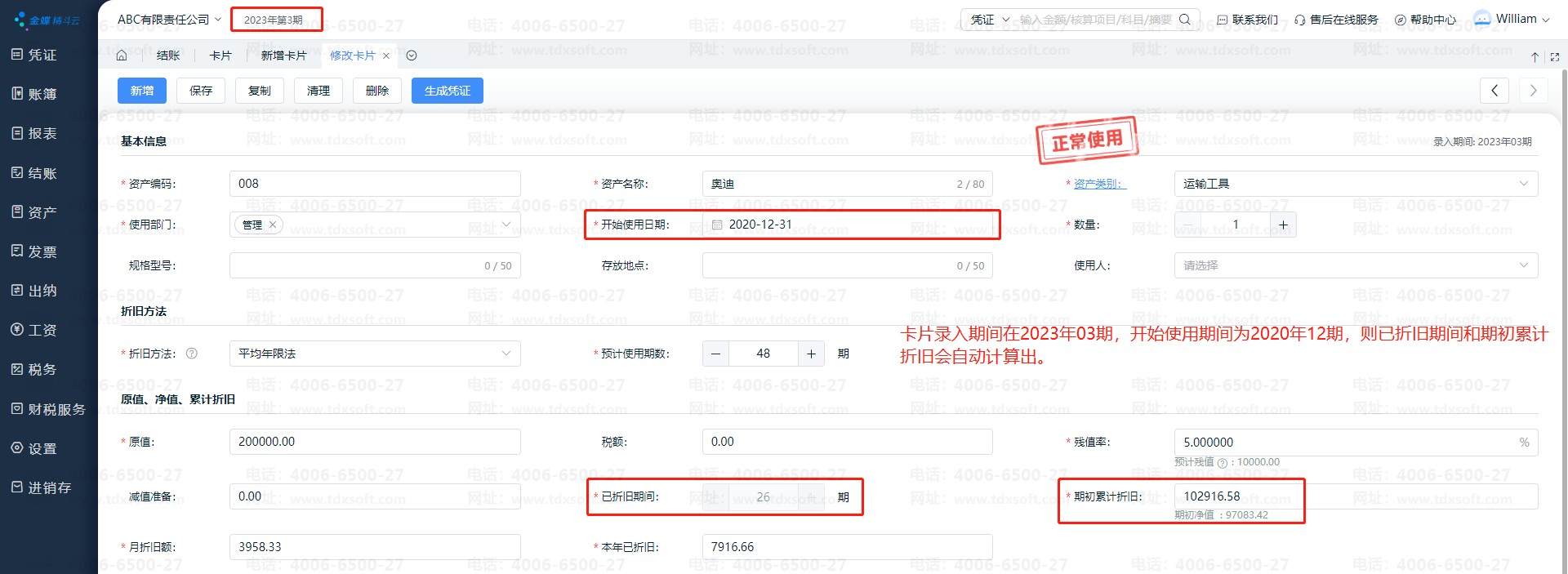 注意:已折旧期间不支持修改,按卡片的录入的开始使用期间及当前账套期间计算
