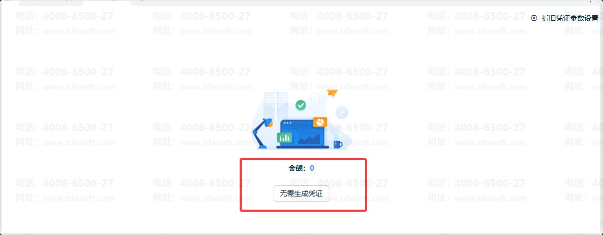 注意:若截止至当期未录入卡片,则折旧凭证界面,显示“金额:0,无需生成凭证”。