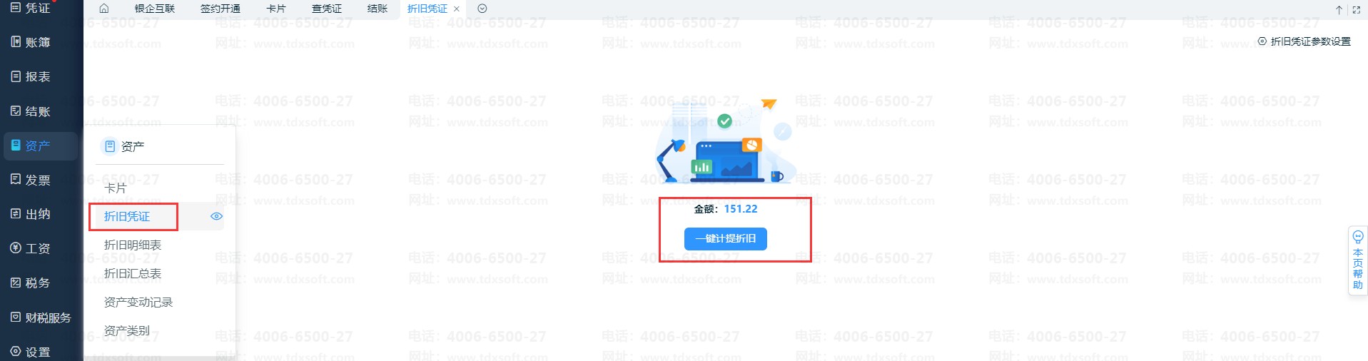 ①当期所有符合条件的卡片,系统将汇总生成一笔折旧凭证。