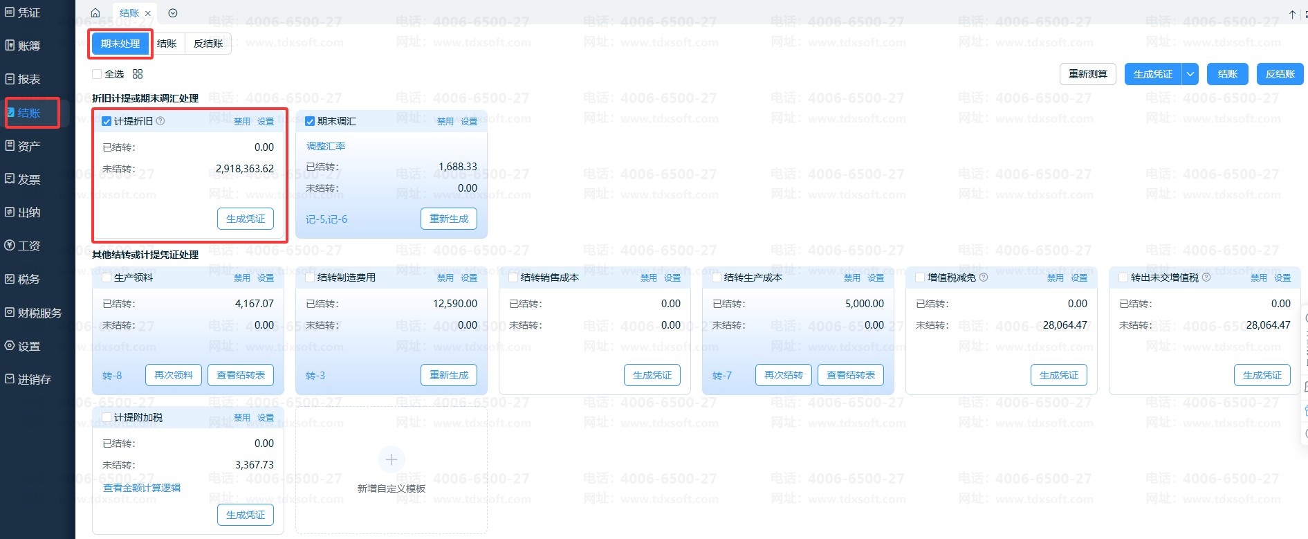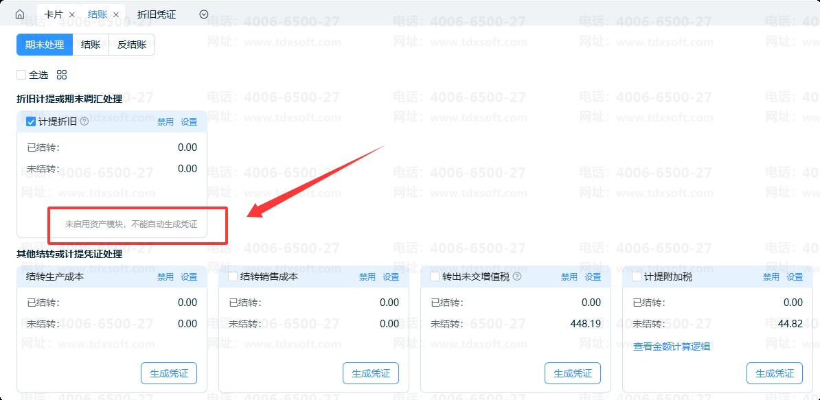 注意:若截止至当期未录入卡片,则计提折旧的结转模板上无【生成凭证】按钮,结转金额为0,且显示“未启用资产模块,不能自动生成凭证”。