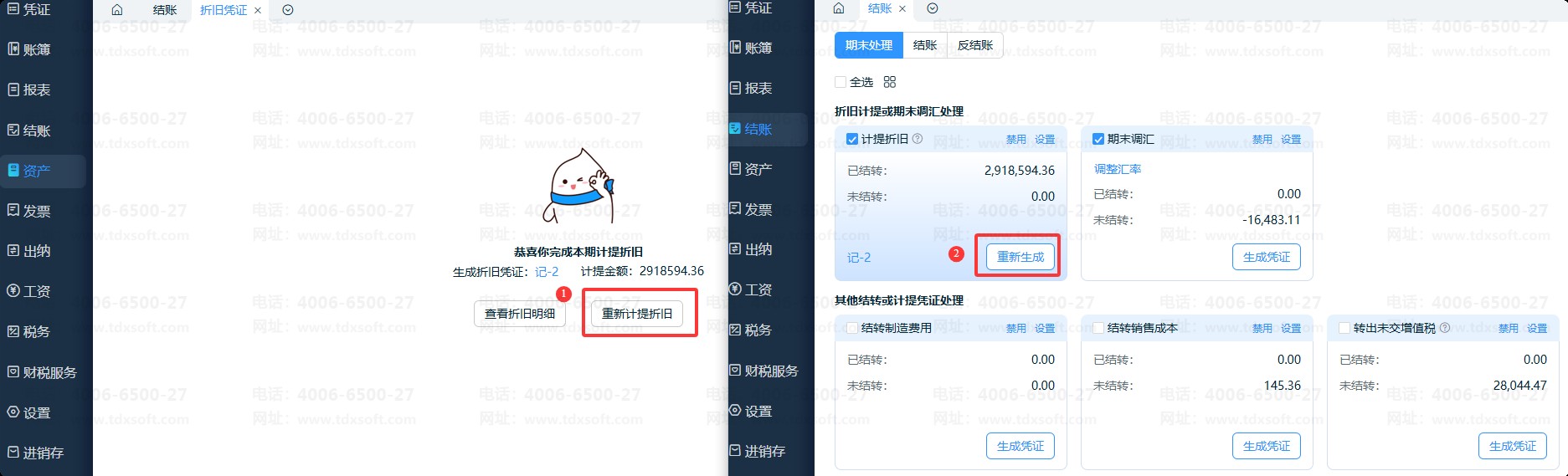 点击【重新计提折旧】或是【重新生成】,即可再次重新计算并生成折旧凭证,并将原系统已生成的折旧凭证覆盖。