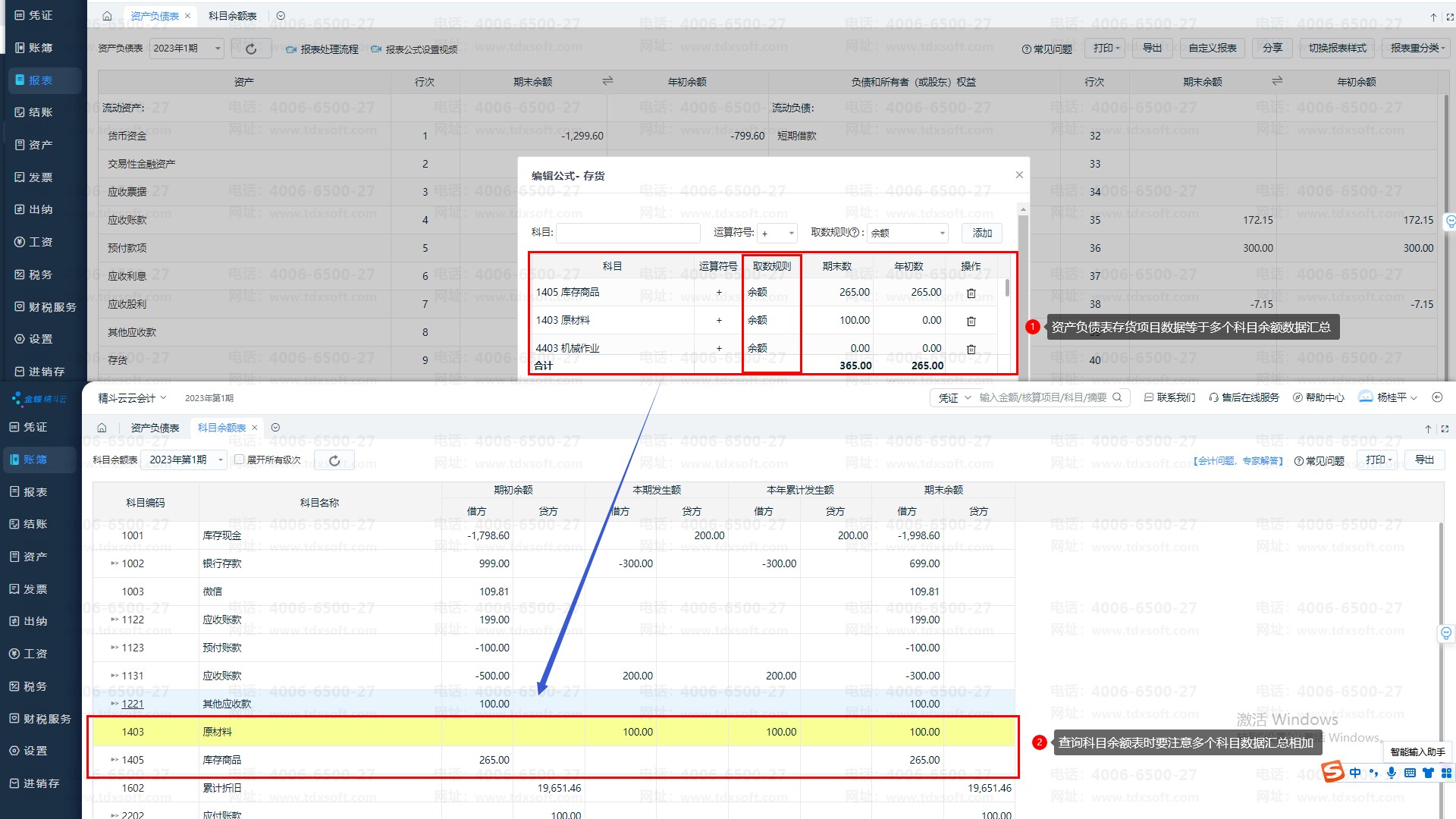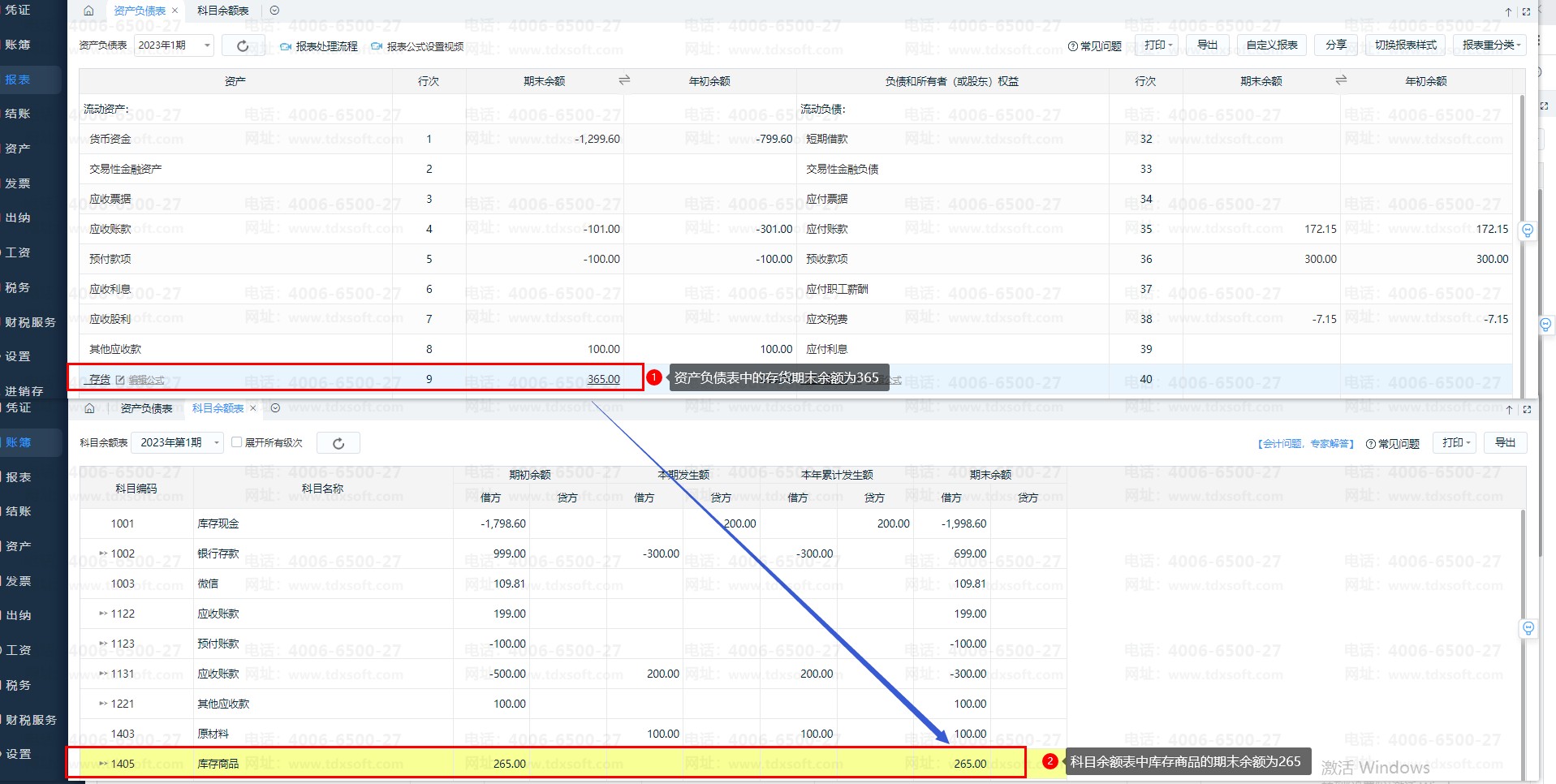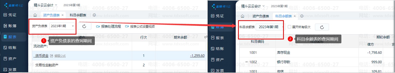 打开资产负债表和科目余额表查询数据时注意左上角的查询期间应该保持一致。
