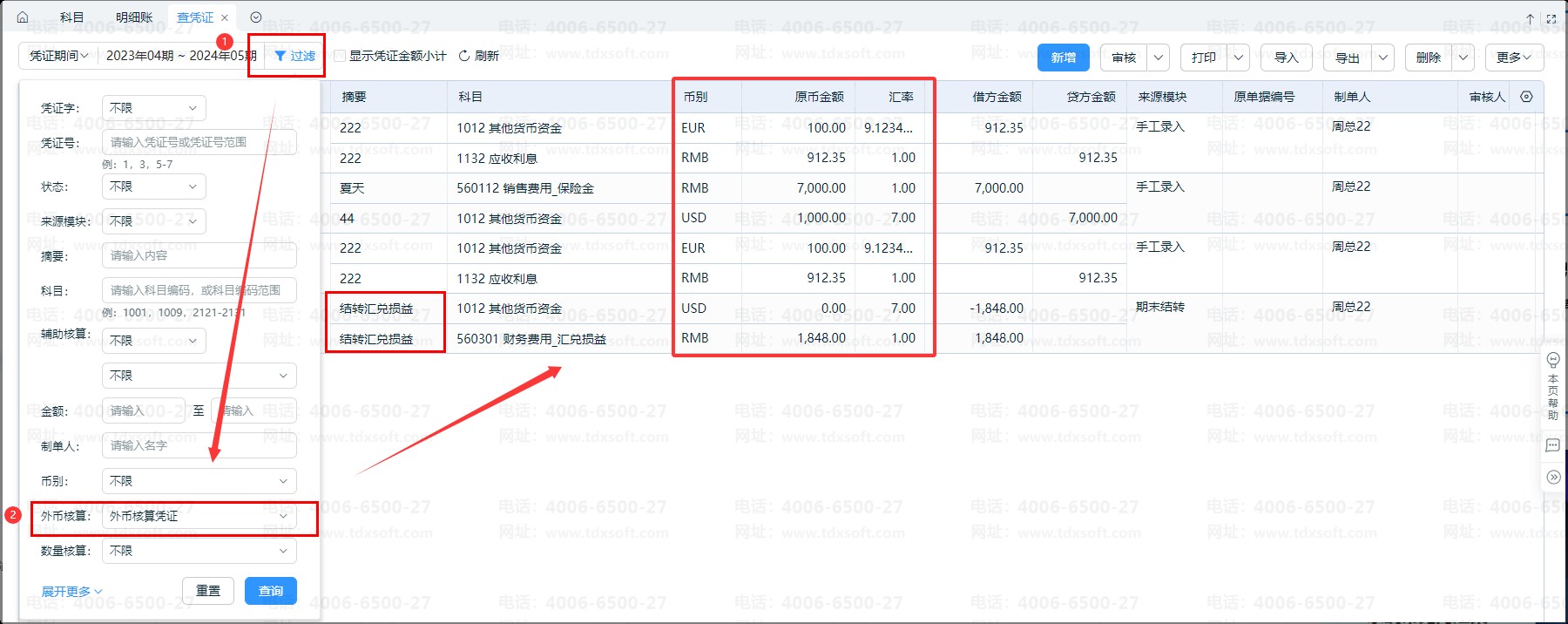 2、凭证汇率查询:通过【查凭证】功能,按 “外币核算凭证” 条件过滤查询。具体操作步骤可参考:查凭证界面,如何查询/显示所有币别?