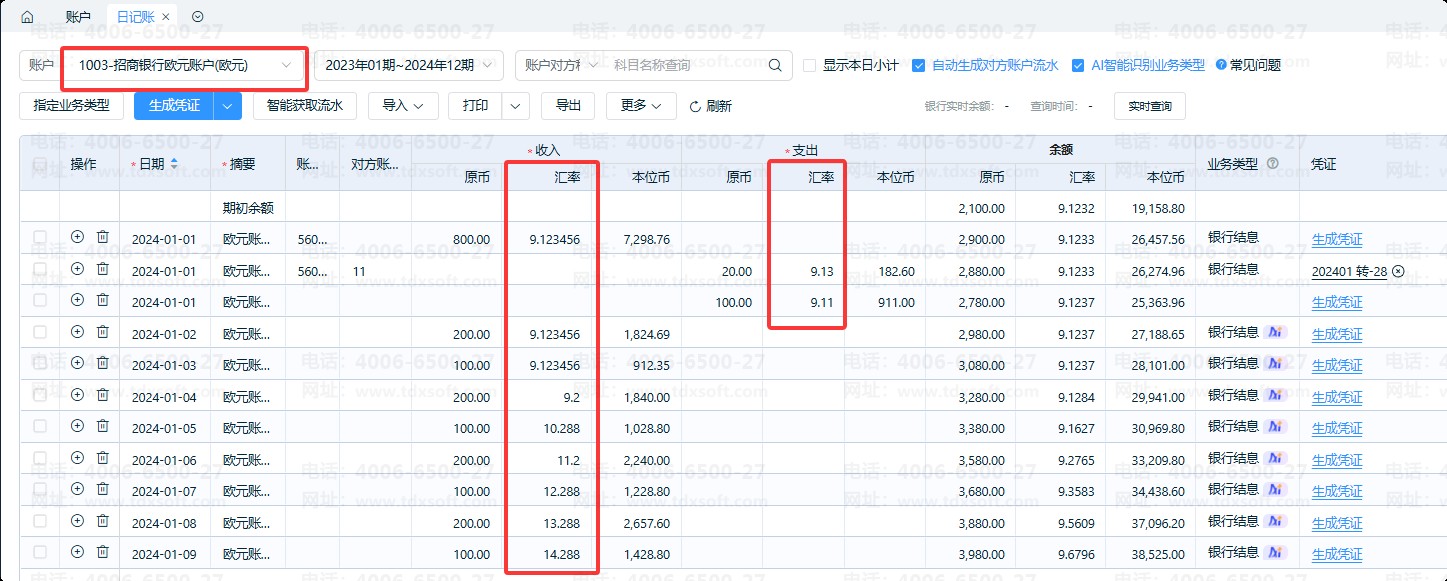 4、日记账汇率查询:外币账户录入日记账后,按该账户查询即可查看历史汇率。