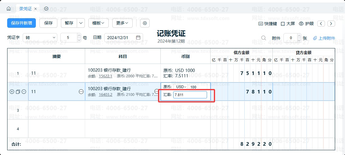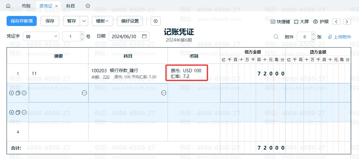 ①汇率修改成功后,新增财务初始余额、新增凭证、当期期末调汇调整汇率、新增外币账户日记账时,系统会自动带出更新后的汇率。如图: