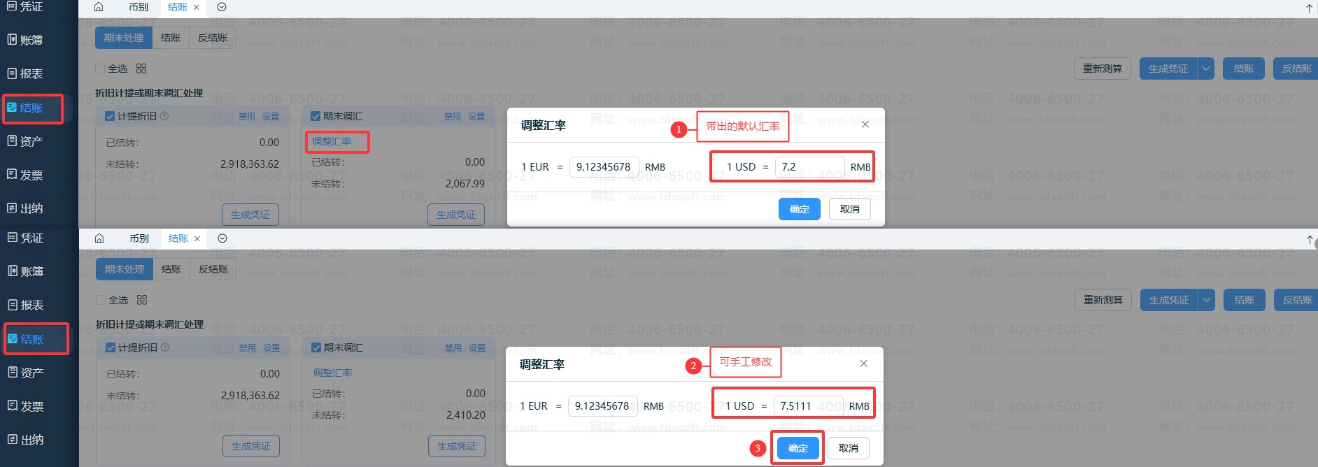 4、结账模块中,期末调汇的调整汇率;