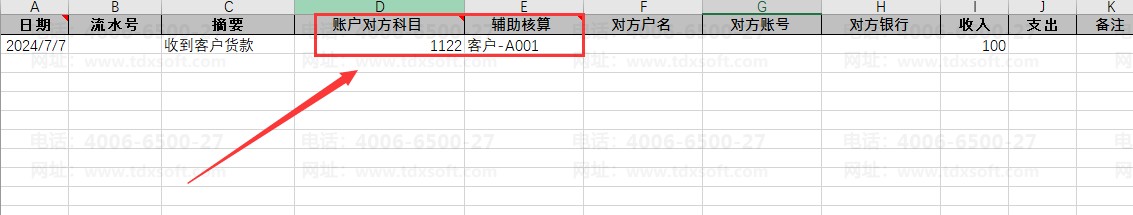 银行收到供应商货款100元,账户对方科目为1122-应收账款,应收账款设置了客户的辅助核算,客户辅助核算编码为:A001,导入模板按下面示例填写: