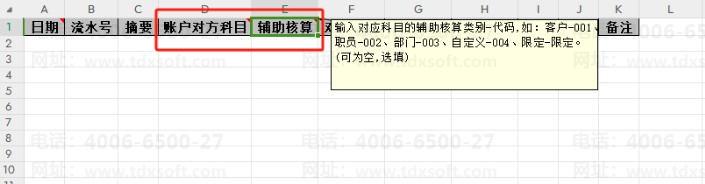 辅助核算:是指若科目设置了辅助核算,输入对应科目的辅助核算类别-代码,如:客户-001、 职员-002、部门-003、 自定义-004、限定限定。(可为空,选填)