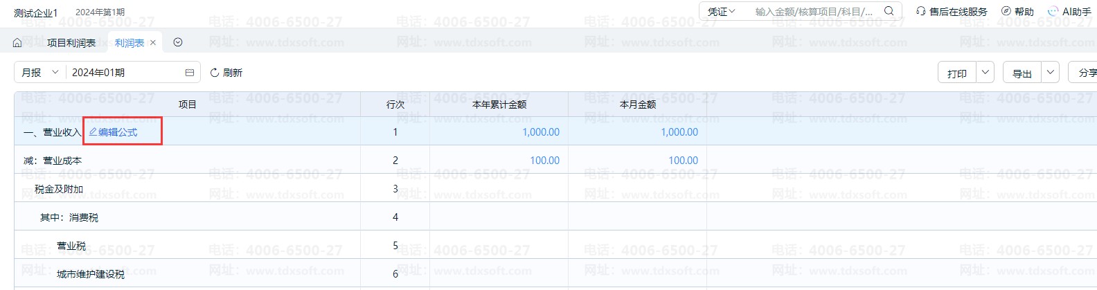 利润表界面,点击每个项目后面的“编辑公式”,可以查看项目的取数公式,可以对公式进行编辑和修改