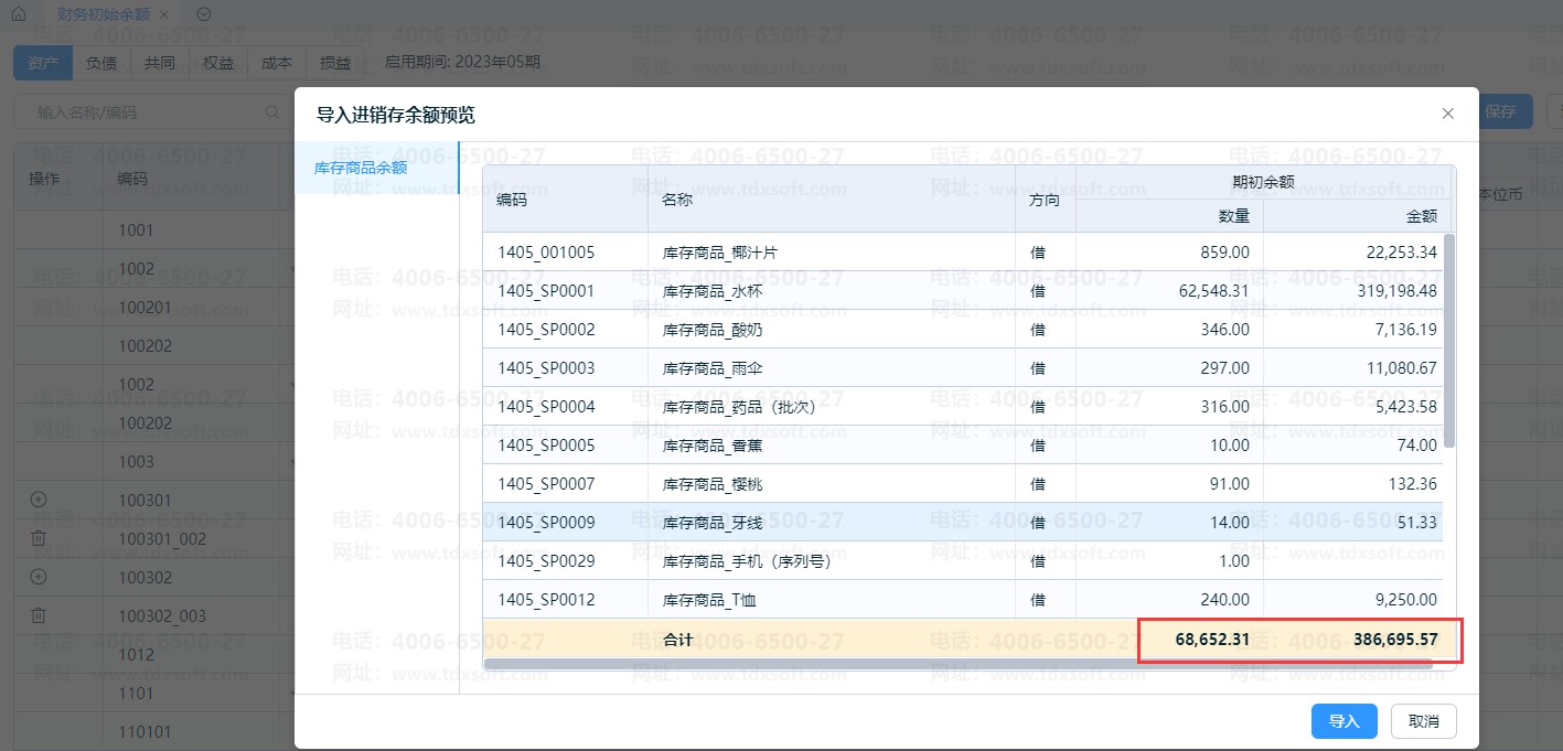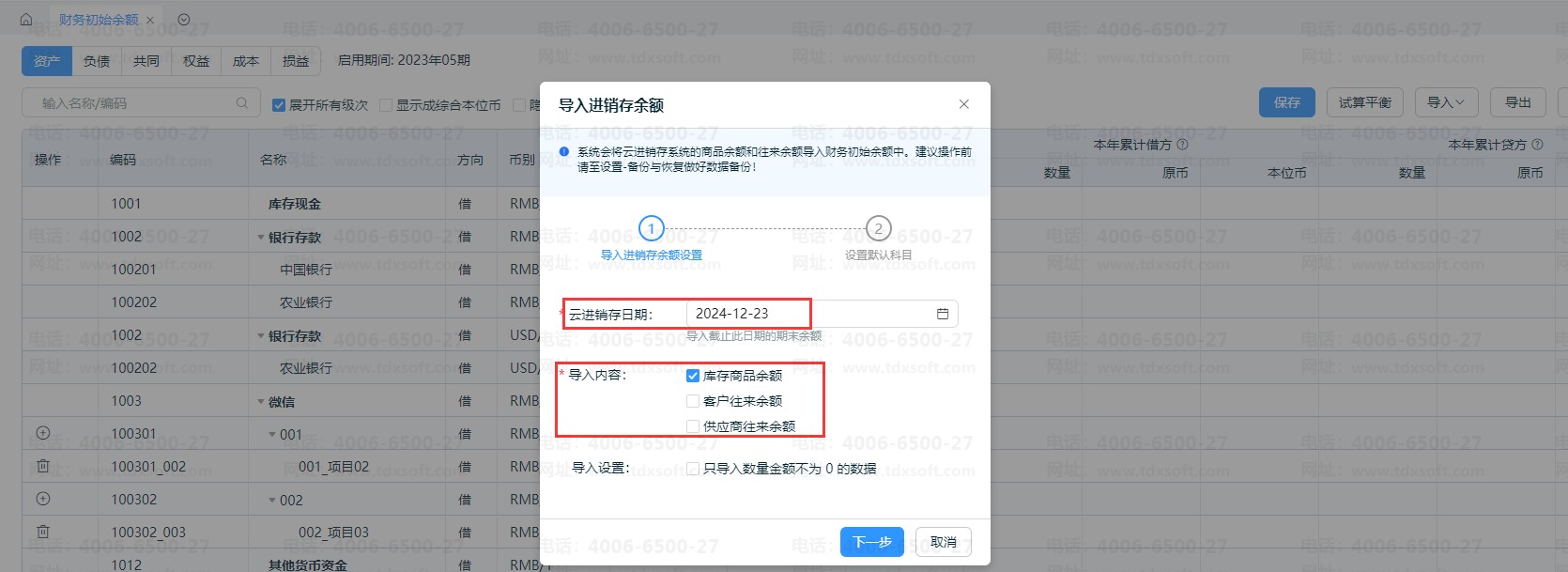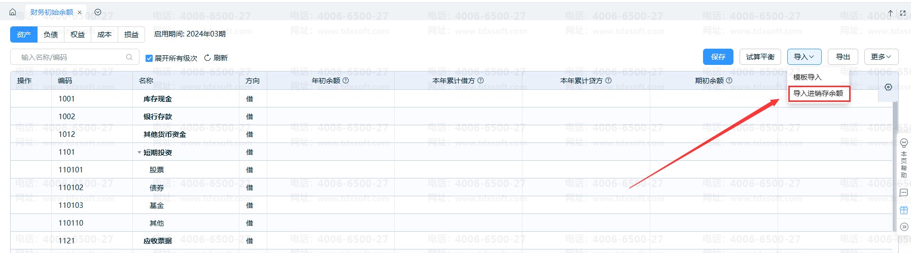云会计点击【设置】-【财务初始余额】,点击右上角<导入>按钮,选择“导入进销存余额”