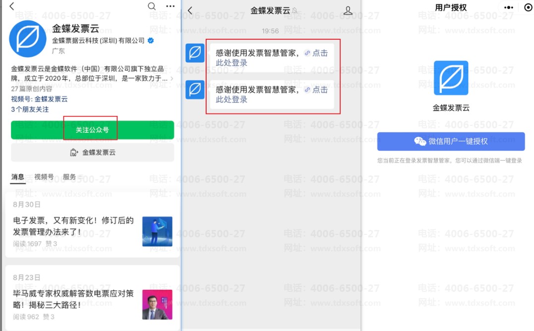 2、关注【金蝶发票云】公众号-点击【登录】-微信用户一键授权登录