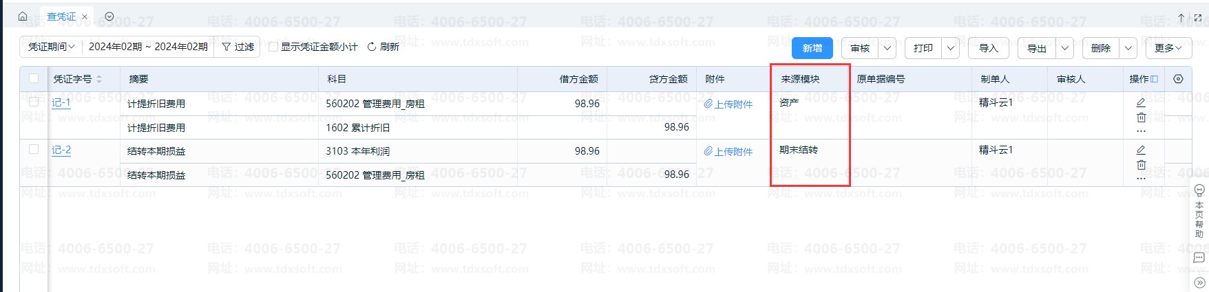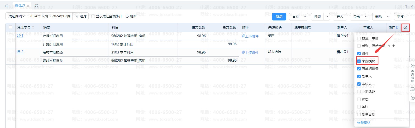 另外,可在【查凭证】界面可以检查凭证来源,如没有显示【来源模块】,可以点击右上角