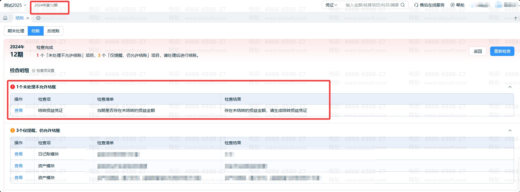选择按年结转损益时,12期未结平损益,无法结账到下一期: