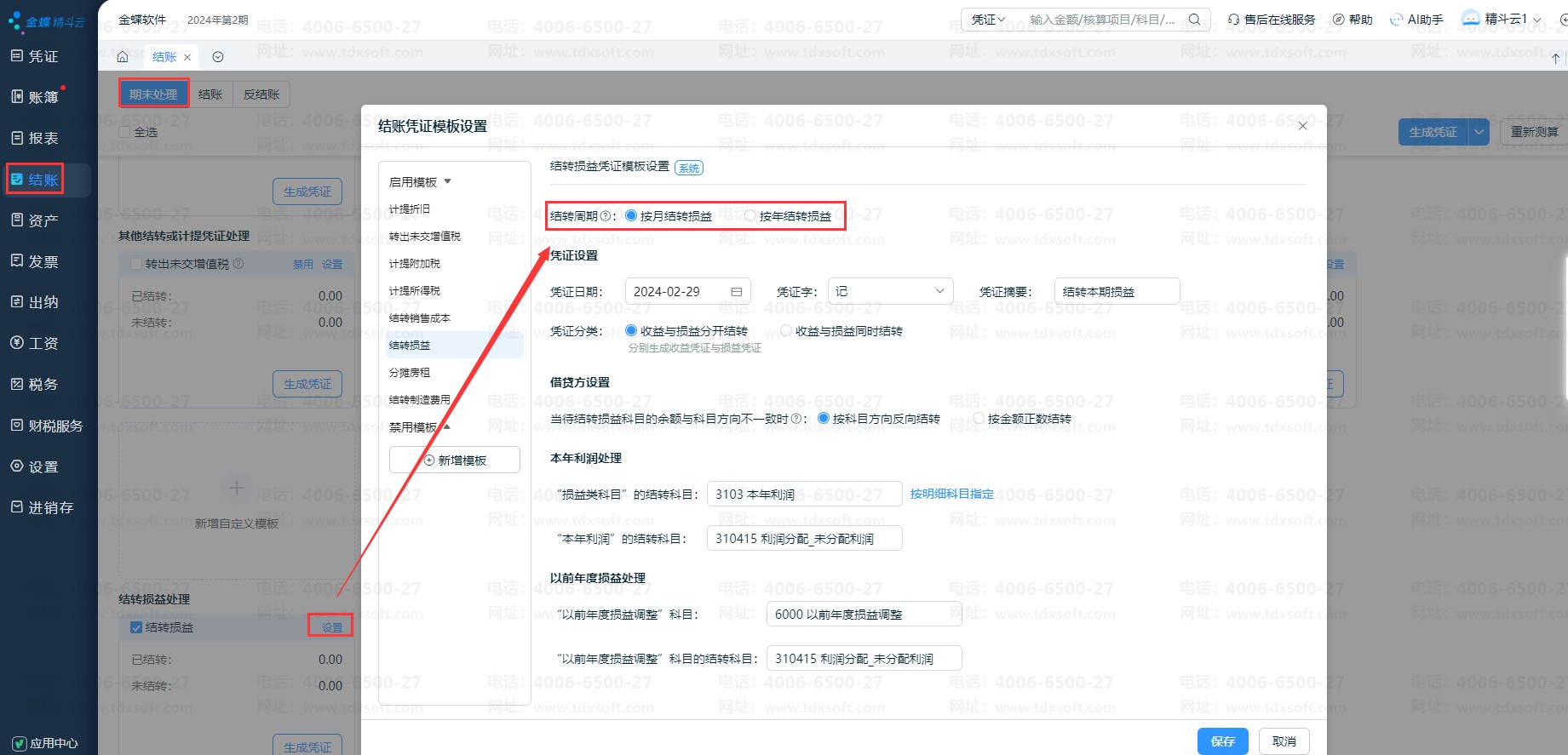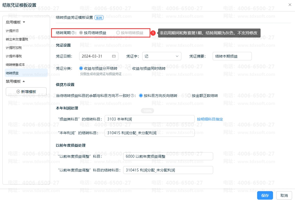 云会计系统支持设置结转周期:支持按月结转损益或按年结转损益。