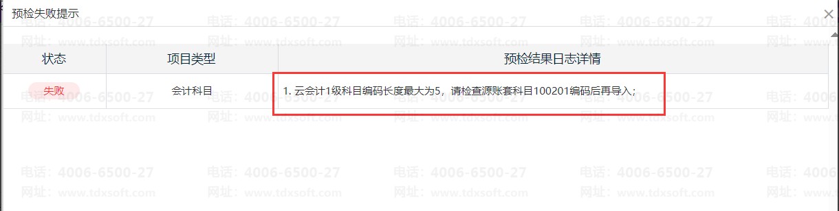 第三方导入失败提示“云会计1级科目编码长度最大为5,请检查源账套科目XXXXXX编码后再导入”