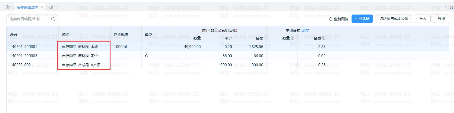 如图:库存商品的二级明细科目有原材料和产成品,但结转时只带出原材料的数据。