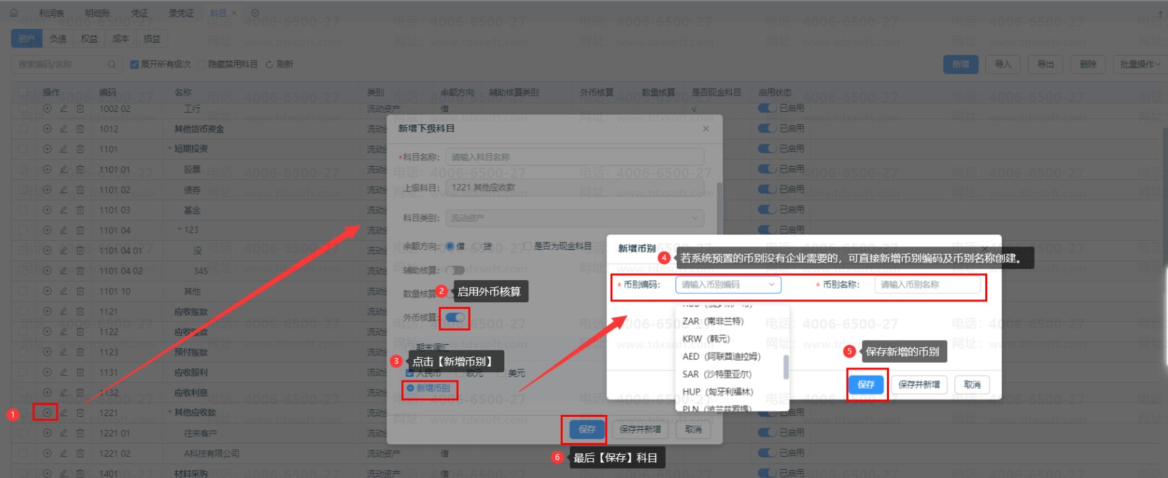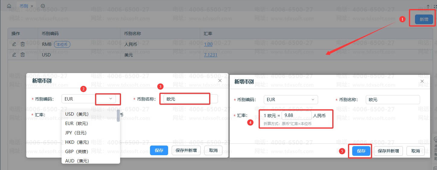 ②点击“新增币别”,参考上述步骤选择预设外币或是新增币别编码等信息。