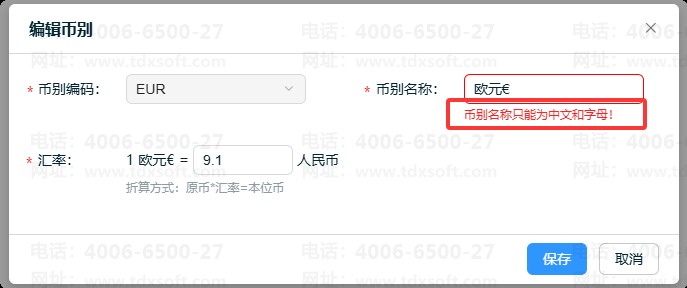 注意:目前不支持编辑及显示币别符号。输入币别符号后,币别无法保存成功。