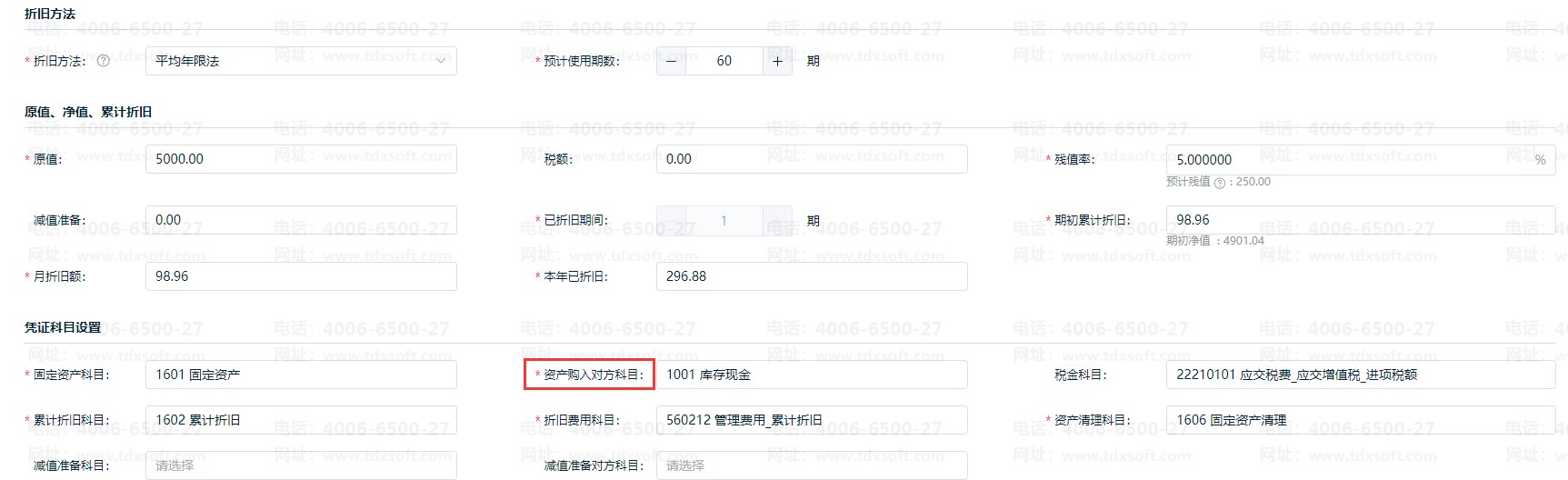 ②若是补录以前旧固定资产卡片,也需要填写“资产购入对方科目”不能为空,但系统不会生成购入凭证,不影响折旧数据。