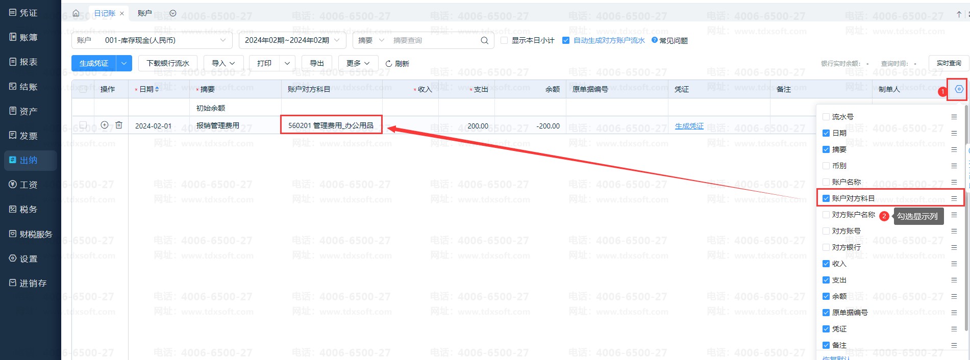 情况2、打开列设置-勾选【账户对方科目】,补充完成该条日记账的对方科目,再生成凭证