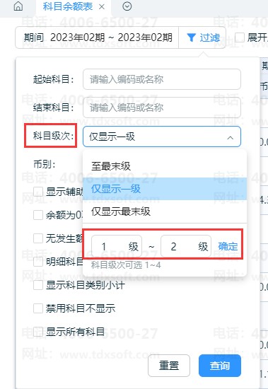 若打印/导出1-2级科目余额,查询条件中的【科目级次】设置为【1级-2级】查询即可,依次类推,其他指定级次科目余额表按此方式查询/打印。