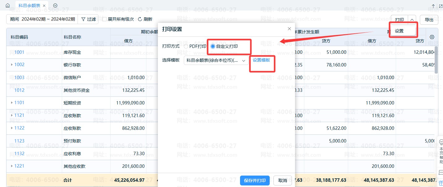 3、打印前可点击打印设置,调整打印参数。另外,科目余额表打印格式系统现已支持自定义打印格式,选择【自定义打印】-【设置模板】即可跳转至自定义打印模板界面。